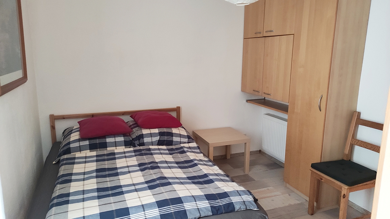 Shared use of garden, private use of terrace, living room with sofa bed and workspace, bedroom with 1.40 m French bed. Bed linen and towels provided. High-speed fiber optic internet connection, pets allowed by arrangement, parking lot option for rent, non-smoking, max. 2 people, minimum rental period 6 months. Rent including utilities: including electricity, including heating, plus final cleaning according to expenditure.