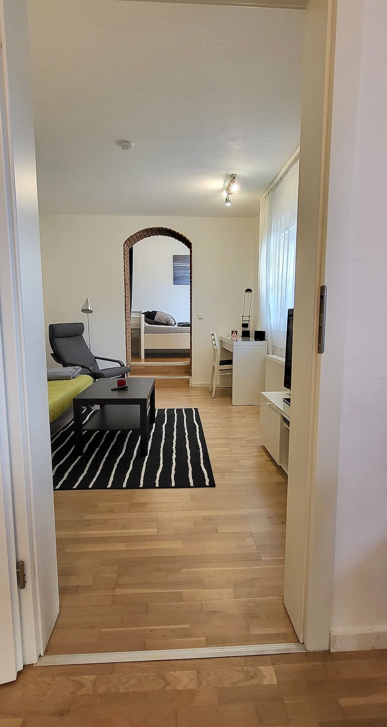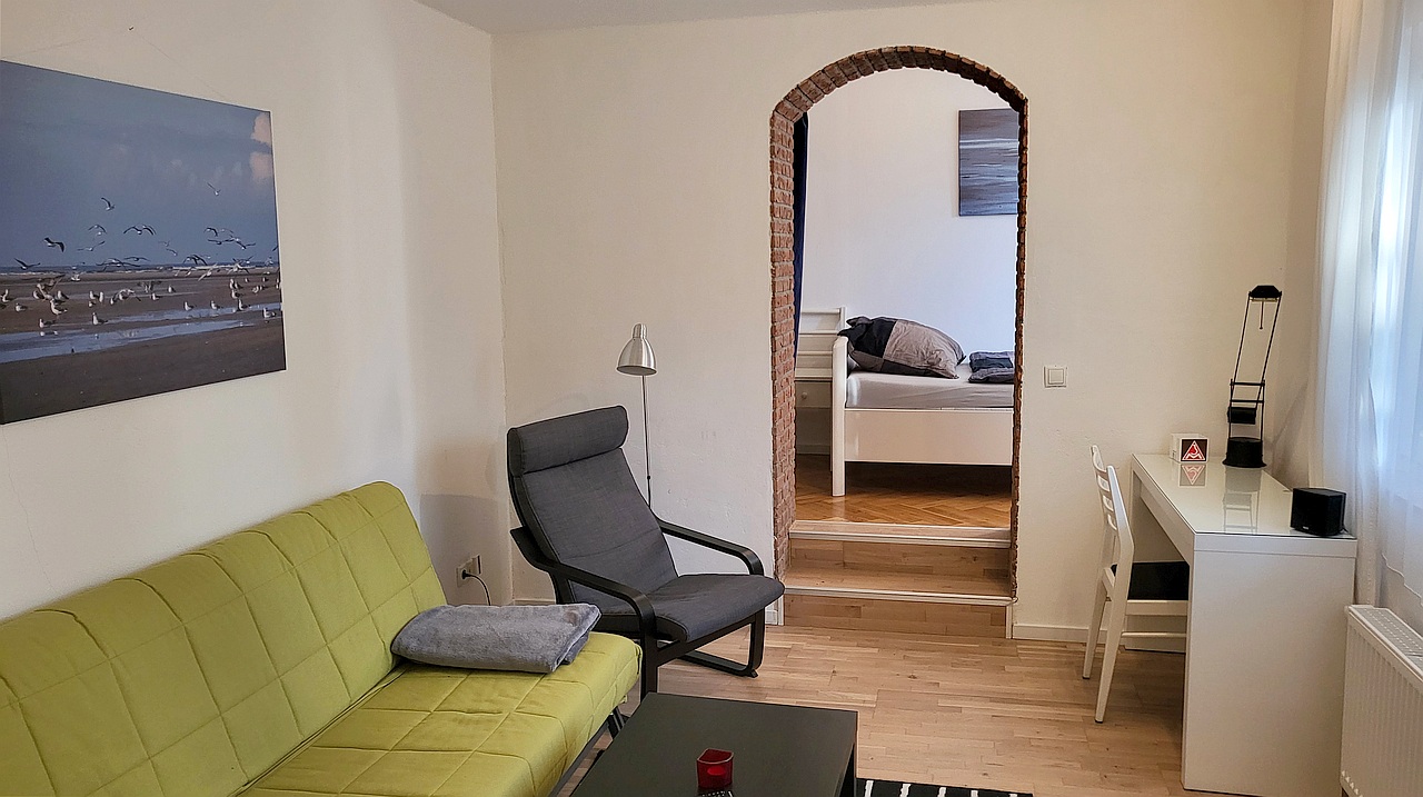 Kitchen in the entrance area, living room, small bedroom with single bed 1.00m, bed linen and towels available, incl. WLAN Internet connection, good parking facilities on the street, pets not allowed, smoking only in the courtyard, max. 1 person, minimum rental period 6 months