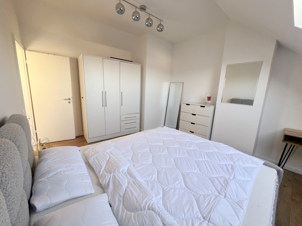 Living room with couch and dining area, bedroom with double bed 1.80 m x 2.00 m. Incl. WIFI internet access, Lockable bicycle storage room on the first floor, bed linen and towels provided. Pets not allowed, non-smoking, parking space optional depending on availability and at an additional cost, max. 2 persons, rental price applies to 1st person. Minimum rental period 6 months