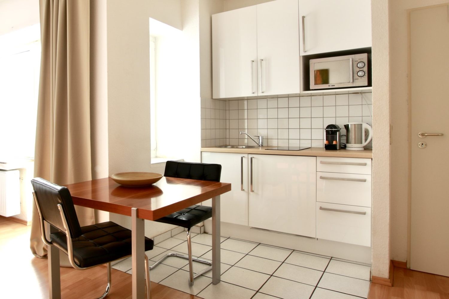 Timeless furniture, carpeted floor, separated fully equipped kitchenette, daylight bathroom with shower, cable-TV, washing machine