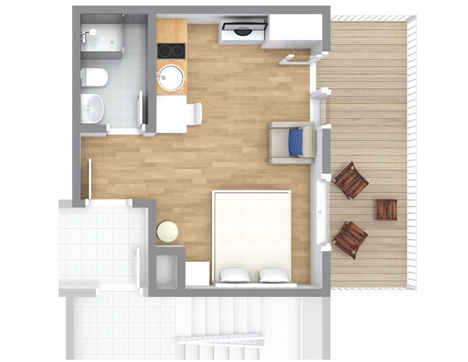 Modern furniture, tiled floor, integrated kitchenette with stove, bathroom with shower, flatscreen, cable TV, WiFi internet connection