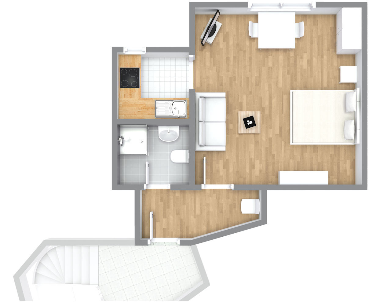 Bedroom with queen-size bed, change of bed linen and cleaning service on request at an extra charge, DSL WiFi internet connection incl., minimum term of lease 2 months, plus final cleaning 180,00 €