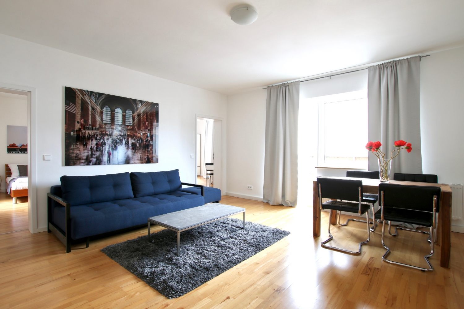 Balcony, living room, 1st bedroom with double bed 1.60 m, 2nd bedroom with queen-sized bed 1.40 m, bed linen and towels available, pets not allowed, smoking only on the balcony, WiFi optionally for 8.00 EUR/week, cleaning and laundry service optionally for a surcharge, minimum term of lease 6 months, plus final cleaning 320,00 €