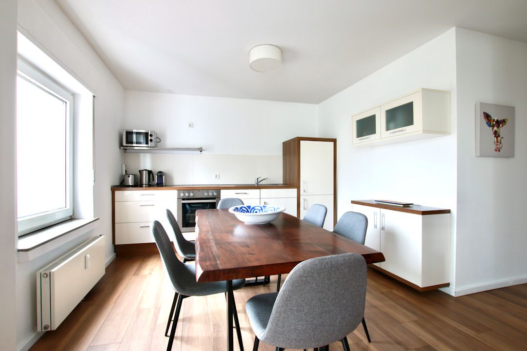 Balcony, living room, bedroom with double bed 1.80 m, 2nd bedroom with queen-size bed 1.40 m, bed linen and cleaning service possible, WiFi incl., smoking only on the balcony, minimum term of lease 6 months, plus final cleaning 320,00 €