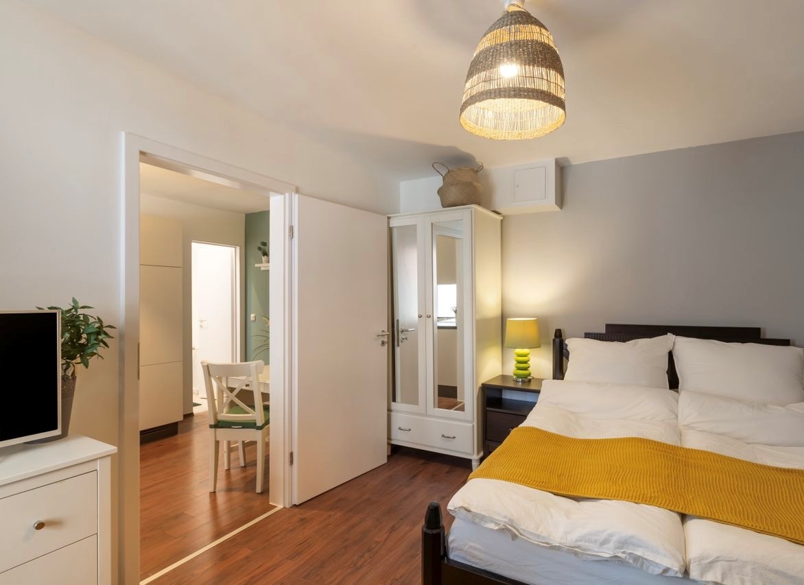 living / bedroom with queen-size bed 1,40m and sofa bed, bed linen and towels available, incl. free WiFi internet access, parking facilities in front of the house, upon request: fortnightly cleaning and laundry service 70,00 EUR/month, non-smoking, pets by arrangement, max. 2 persons, minimum term of lease 6 months, rent applies to 1 person, 2nd person for surcharge
