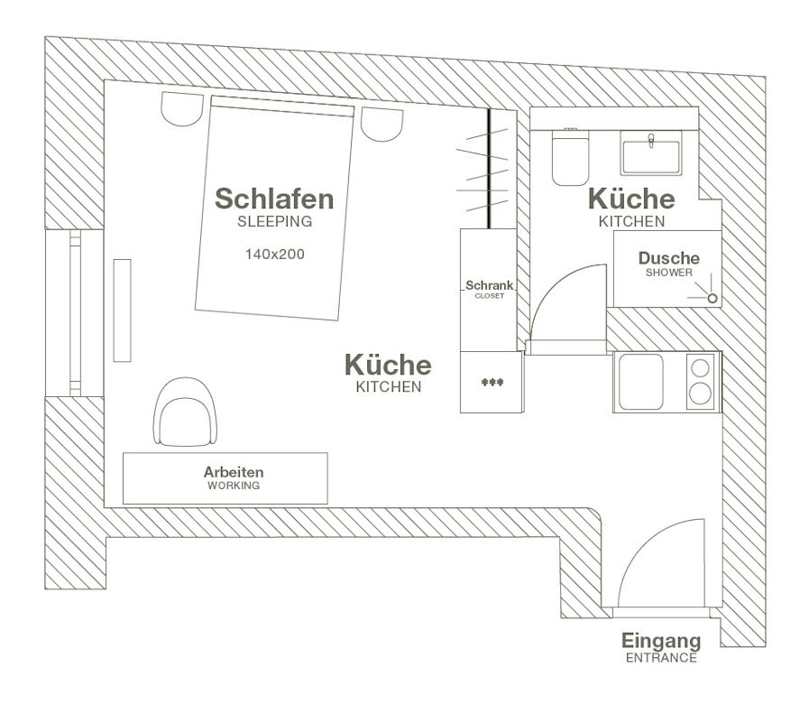 living room / bedroom with queen-sized bed 1.40 m, incl.- Internet, Bed linen and towels not provided, cleaning service by arrangement against surcharge, pets not allowed, non-smoking, max. 2 people, 2nd person against surcharge, minimum term of lease 6 months