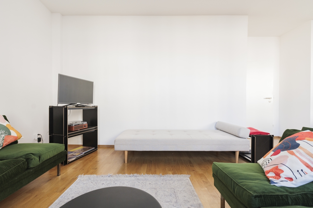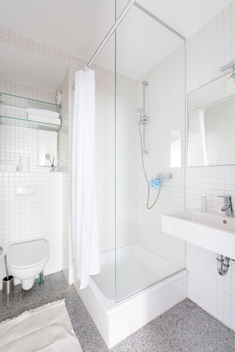 Terrace, living room with pull-out sofa bed 1.40 m, bedroom with double bed 1.80 m, bed linen and towels available, parking space can be rented in the animal garage under the Heumarkt, pets not allowed, non-smoking, max. 2 persons, minimum rental period 6 months — rent incl. additional costs: 1850.00 Euro per month, plus electricity, incl. heating, plus final cleaning by arrangement