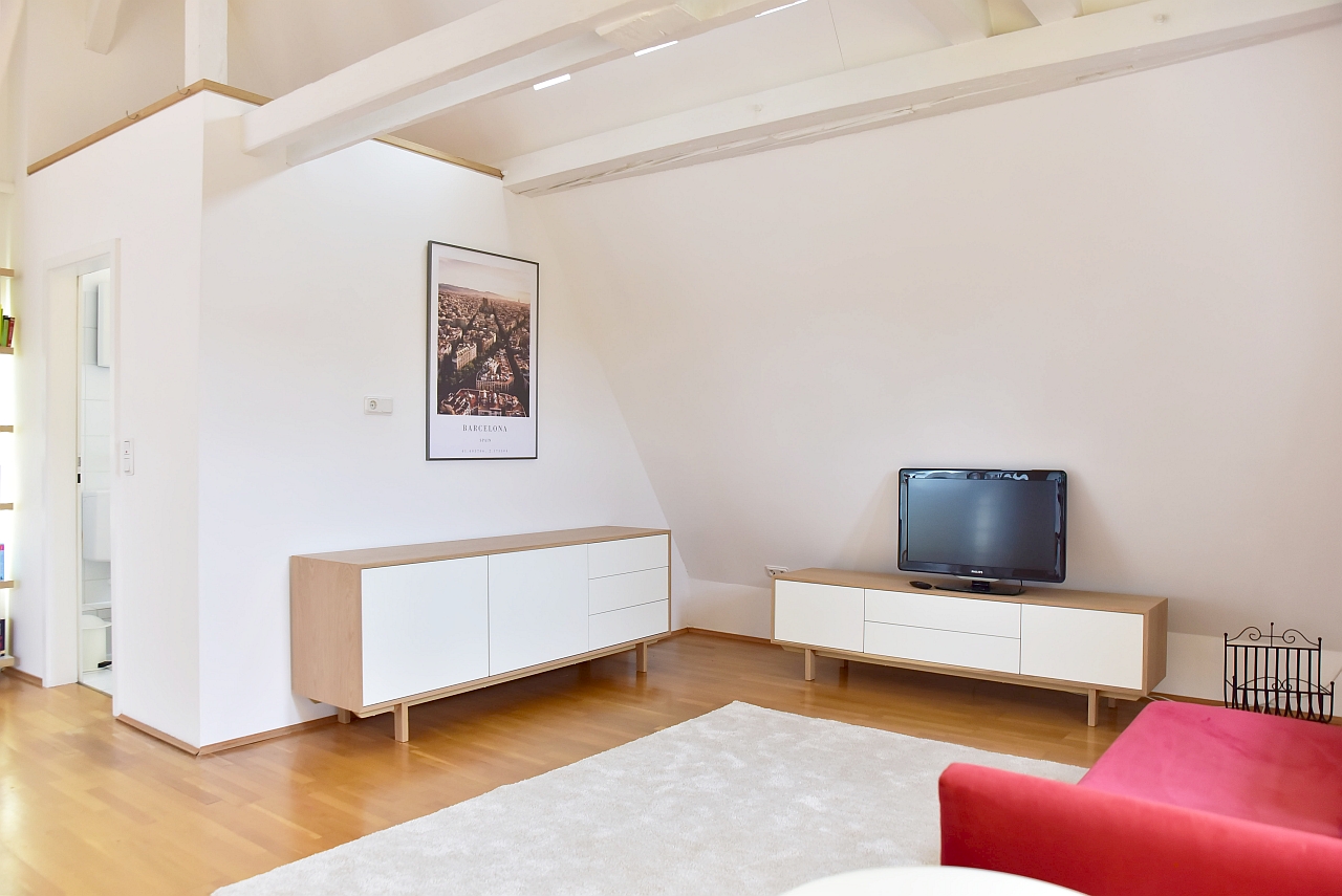 Roof terrace, living room, gallery with 1.60 bed, bedroom with double bed 1.60m, incl. W-iFi internet access, pets not allowed, non-smoking, max. 3 persons, rental price is for 2 persons. Minimum rental period 6 months