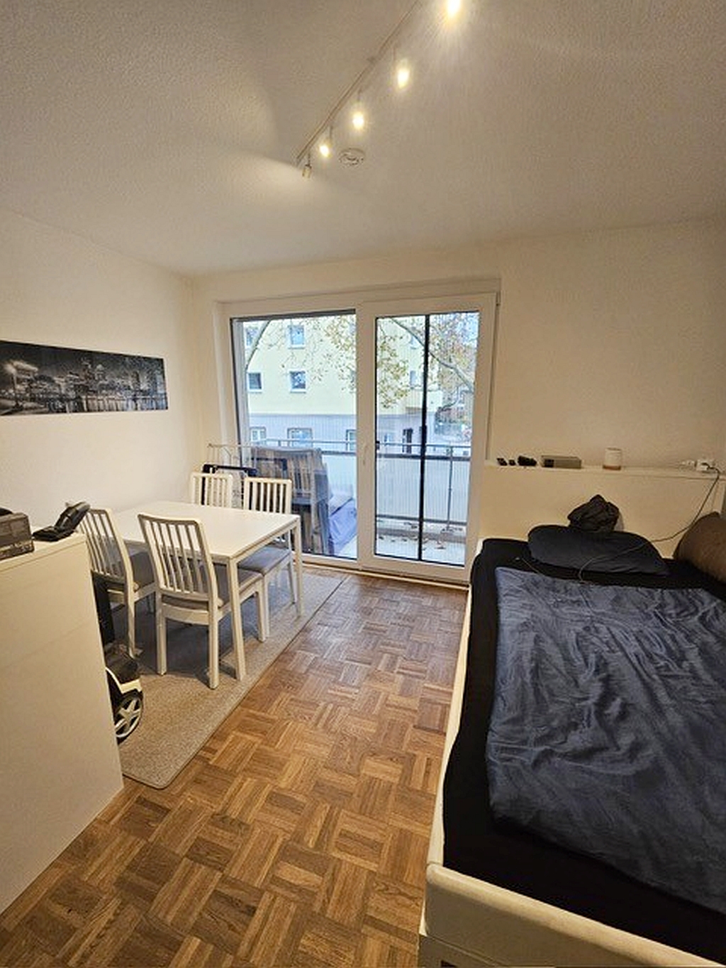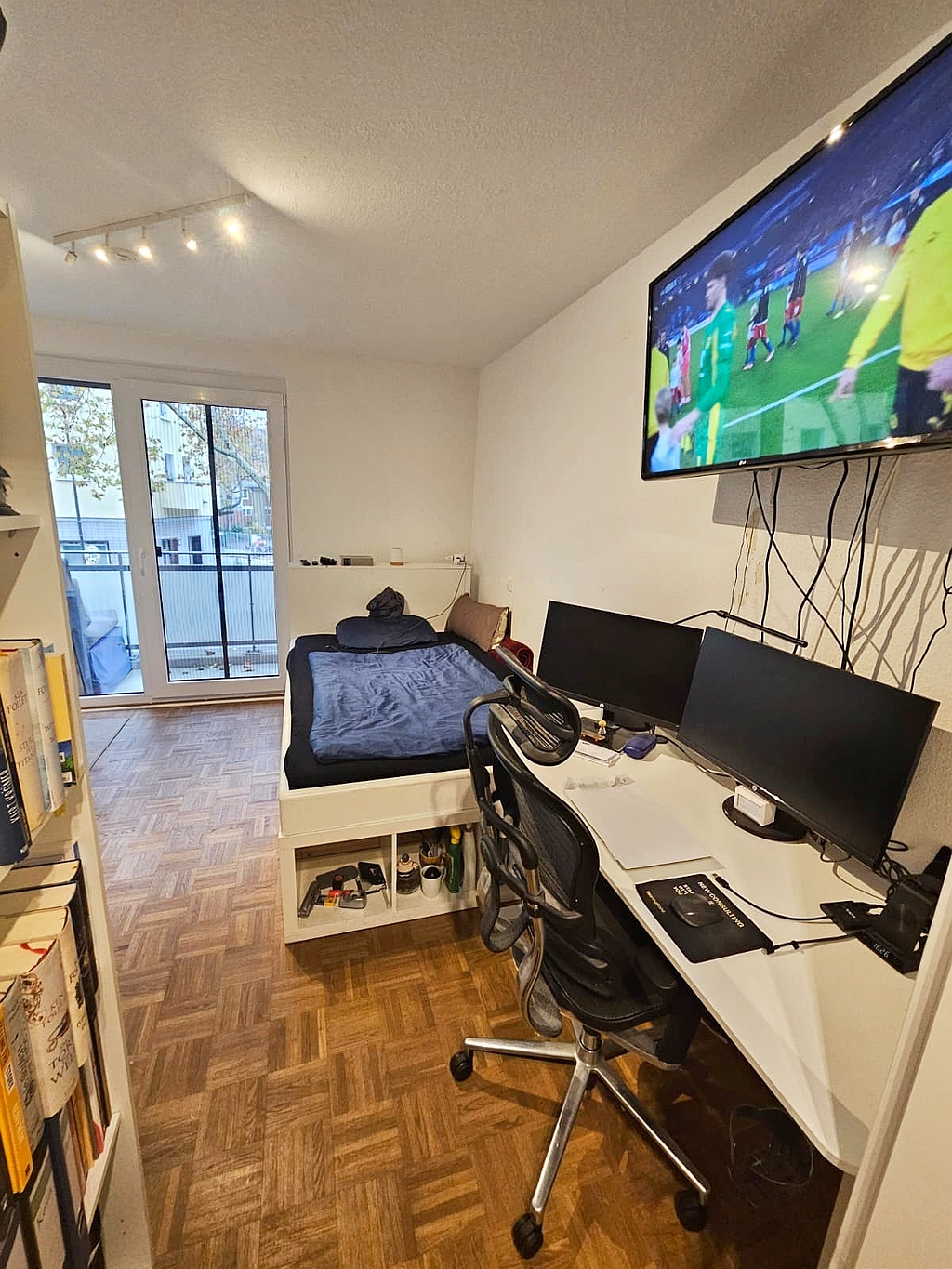 Balcony, living room/bedroom with single bed 0.90 x 2.00 m, bed linen and towels provided, free WiFi included, pets not allowed, non-smoking, max. 1 person, minimum rental period 6 months, rent including utilities: 1100 euros per month, including electricity, including heating, plus final cleaning by arrangement.