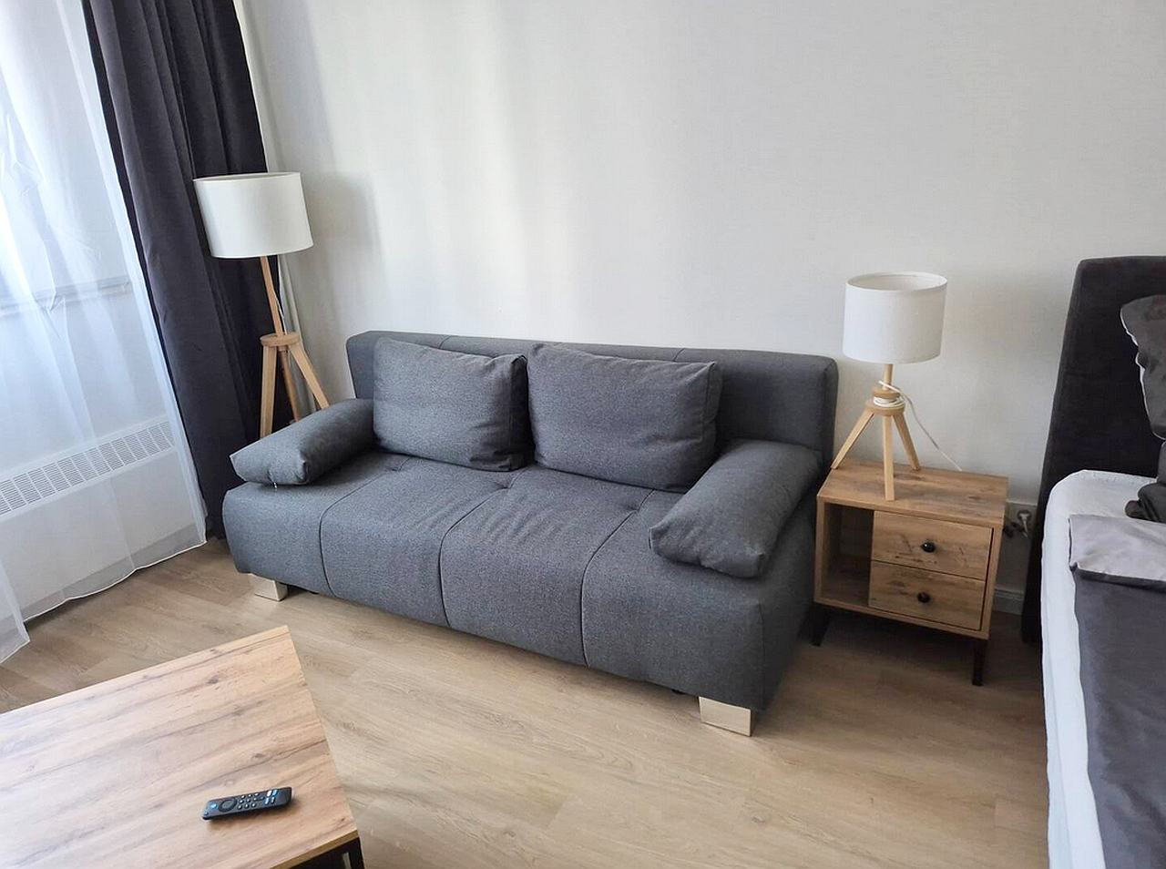Living room/bedroom with double box spring bed (160 x 200 cm), sofa bed (140 x 200 cm). Bed linen and towels provided, including high-speed WiFi internet connection, pets not allowed, non-smoking, max. 3 people. Minimum rental period 6 months. Rental price is for 2 people. For 3rd person occupancy, surcharge of €100. Rent including utilities €1,500.00 per month, including electricity, including heating, plus €120 final cleaning.