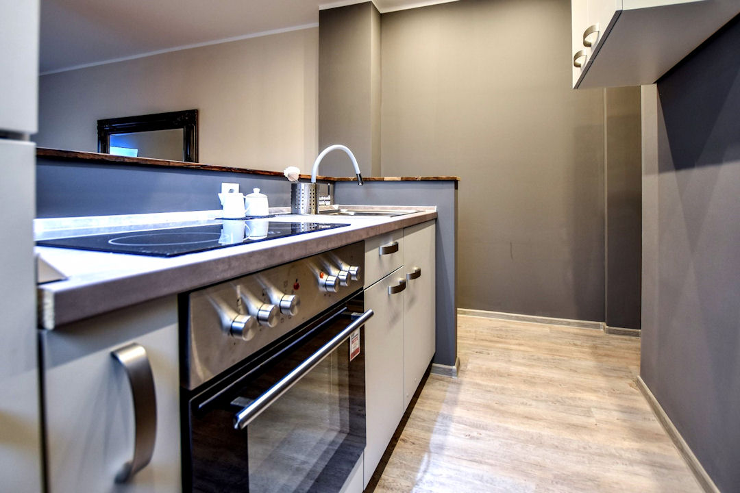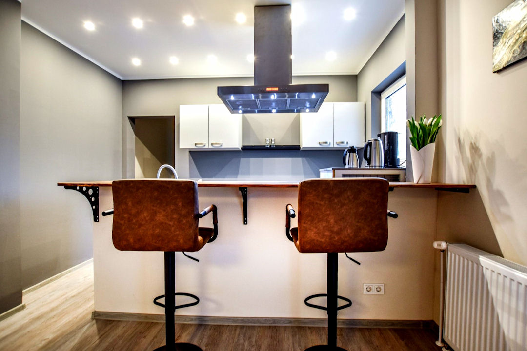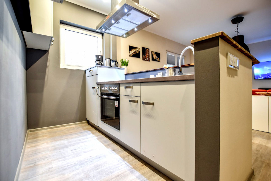 Moderne Möblierung, Laminat, integrierte Einbauküche mit Theke, Tageslicht Badezimmer mit Dusche, Smart TV, WLAN Internetanschluss, Soundbar, Waschmaschine im Keller