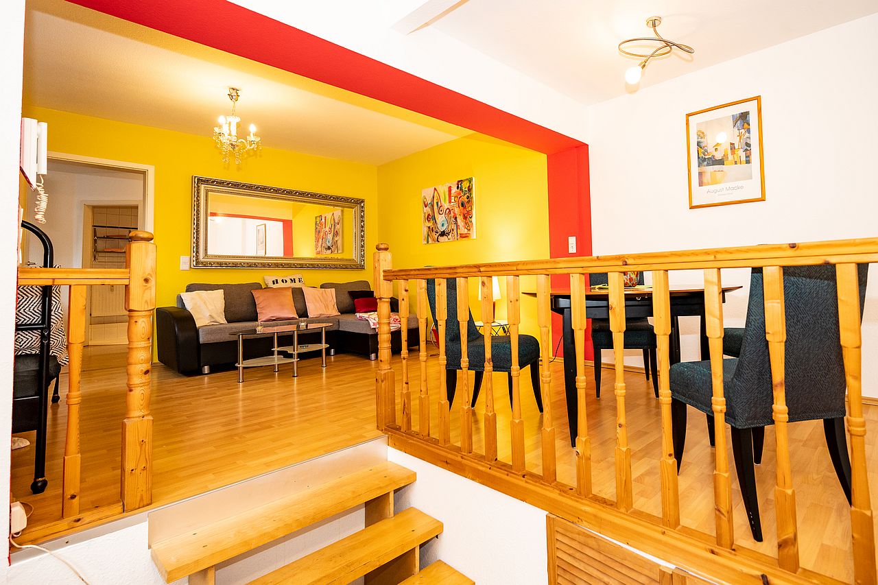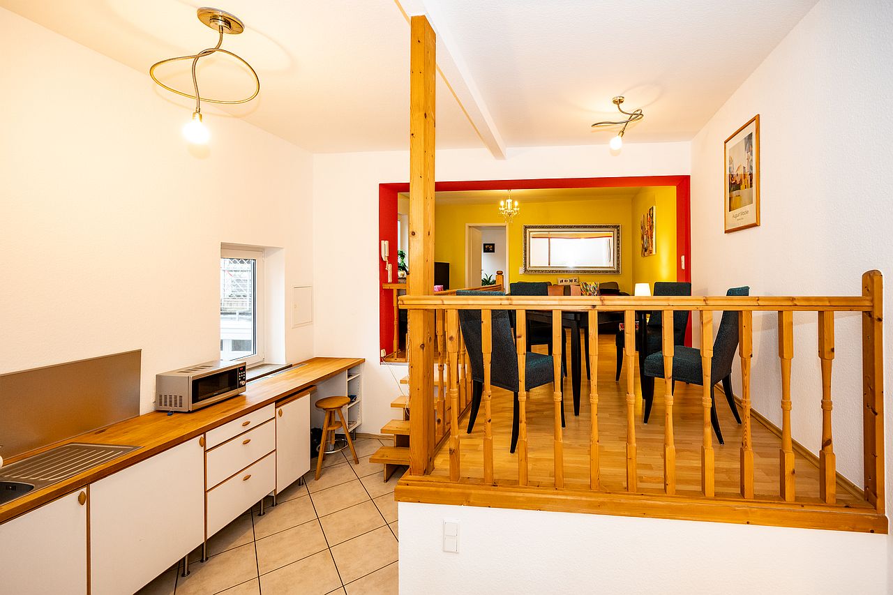 Zeitlose Möblierung, Laminatboden, optisch getrennte Einbauküche mit Spülmaschine, und Kühlschrank mit Tiefkühlfach, Badezimmer mit Badewanne und Duschabtrennung, Gäste WC, Sat-TV, Flatscreen, WLAN Internetanschluss, Waschmaschine und Trockner