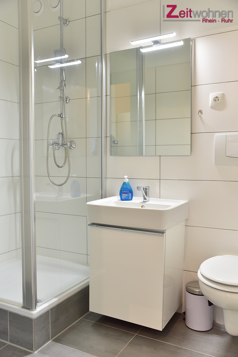 Moderne Möblierung, Fliesenboden, Fußbodenheizung, Küchenzeile mit Mikrowelle und Spülmaschine, Duschbad, Kabel-TV, Waschmaschine und Trockner im Keller