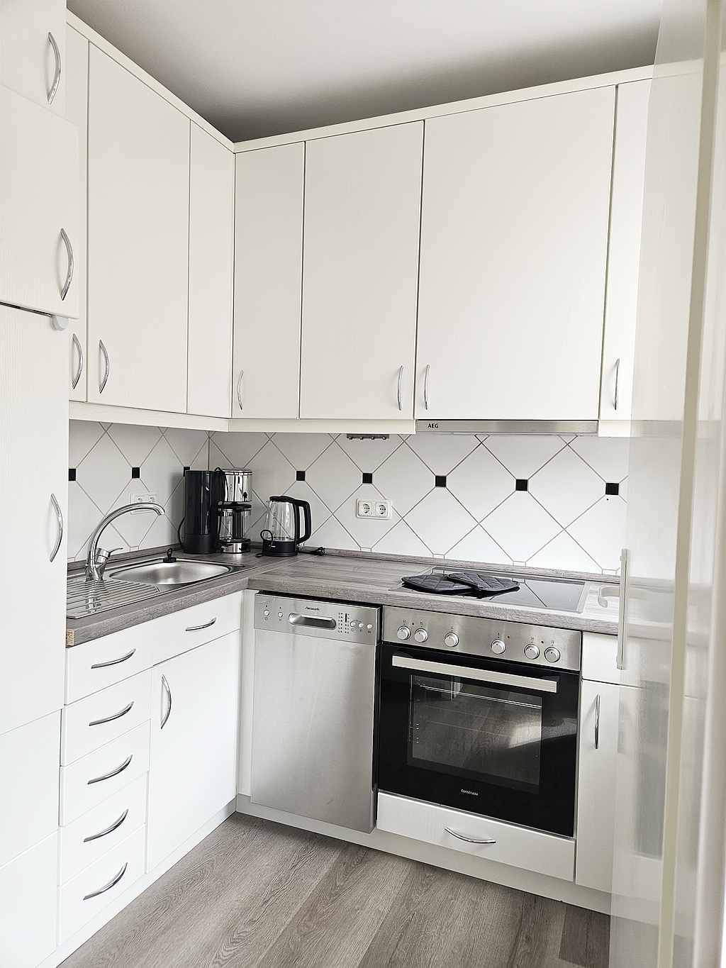 moderne Möblierung, Vinyl- und Fliesenboden, integrierte Einbauküche mit Geschirrspülmaschine, Backofen, Kaffeemaschine und Cerankochfeld, Badezimmer mit Dusche, Flatscreen-TV, WLAN Internetanschluss, Waschmaschine in der Garage