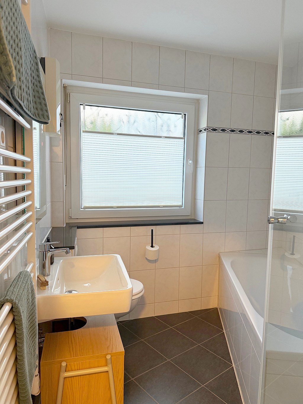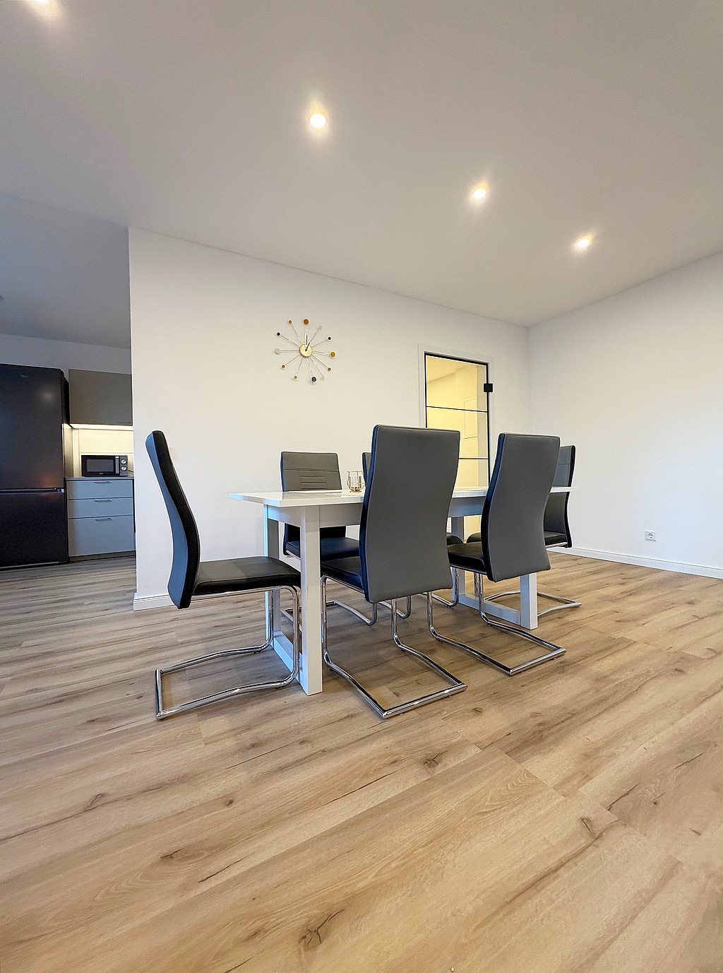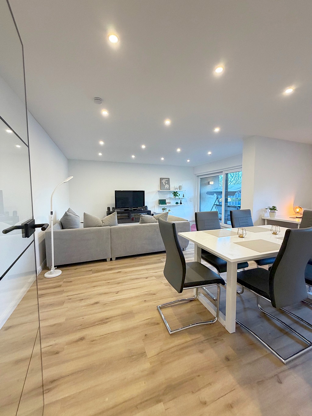 Moderne und hochwertige Möblierung, Kork/Vinylboden, neuwertige Küche, Backofen/Herd, Kaffeemaschine, Toaster. Steuerbare Rollladen, neue Fenster und Schiebetür. Smart-TV (50 Zoll), WLAN Internetanschluss. Tageslicht Duschbad, Waschmaschine und Trockner im Souterrain. Fahrradraum vorhanden.