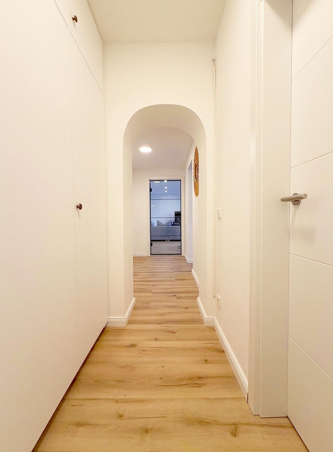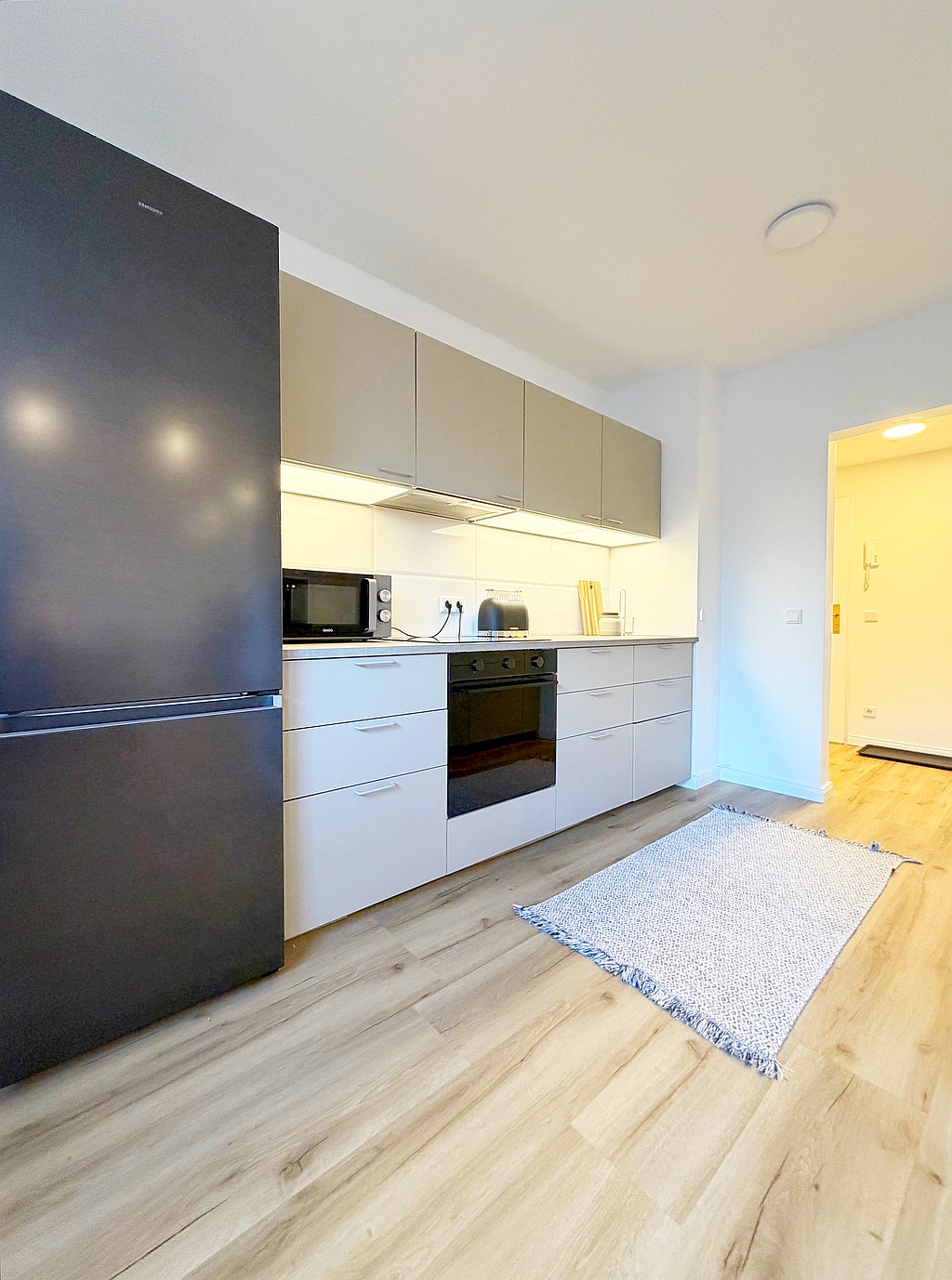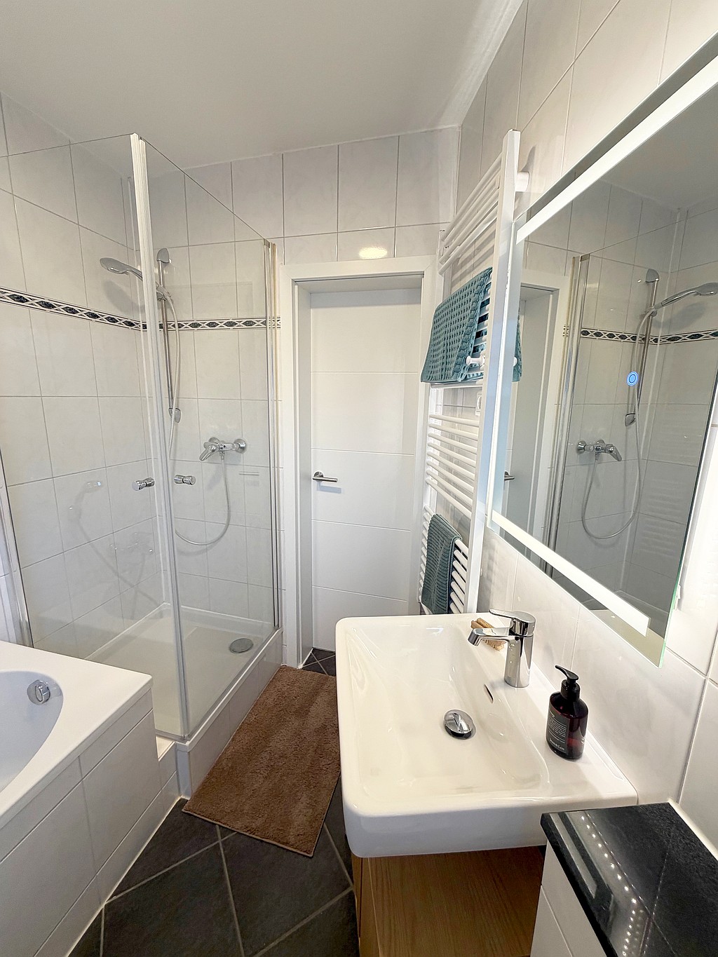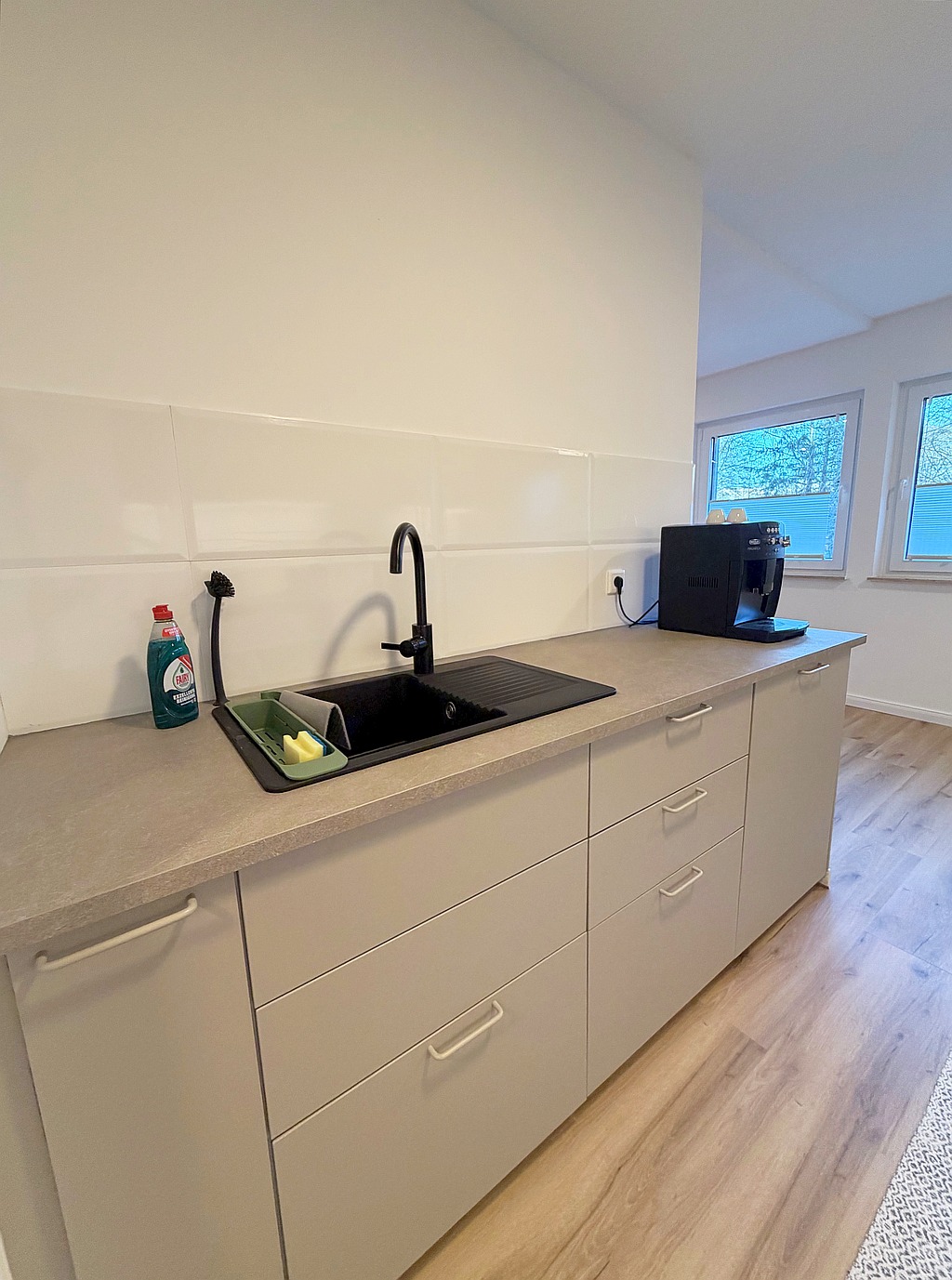 Moderne und hochwertige Möblierung, Kork/Vinylboden, neuwertige Küche, Backofen/Herd, Kaffeemaschine, Toaster. Steuerbare Rollladen, neue Fenster und Schiebetür. Smart-TV (50 Zoll), WLAN Internetanschluss. Tageslicht Duschbad, Waschmaschine und Trockner im Souterrain. Fahrradraum vorhanden.