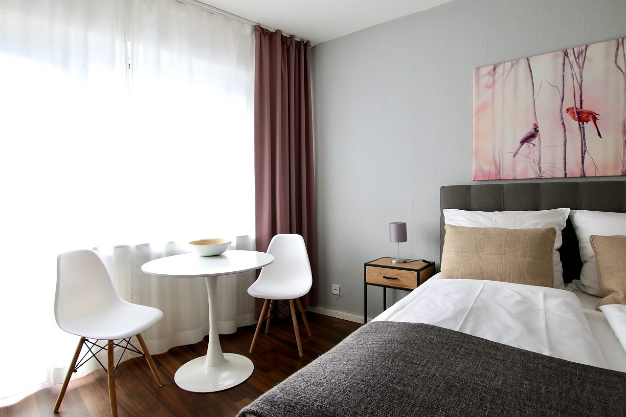 Balkon, Wohn-/Schlafzimmer mit Doppelbett 1,60 m, Bettwäsche- und Reinigungsservice auf Anfrage (gegen Aufpreis) möglich, Waschkeller vorhanden, Tierhaltung nicht gestattet, DSL WLAN-Internetanschluss 8,00 Euro/Woche optional, Mindestmietdauer 2 Monate,