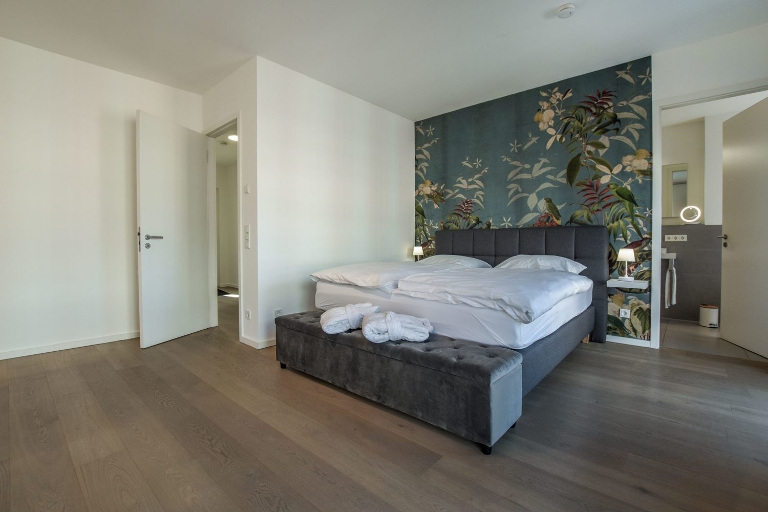 Terrasse, Wohnzimmer, Schlafzimmer mit Boxspringbett 1,80 m, Gäste-/ Kinderzimmer mit Schlafsofa, Büro-/Gästezimmer, Bettwäsche und Handtücher vorhanden, Haustiere nicht gestattet, Nichtraucher erwünscht, 2 Tiefgaragenstellplätze gegen Gebühr, inkl. WLAN-Internetanschluss, max. 4-5 Personen, Mindestmietdauer 6 Monate — Miete inkl.Nebenkosten: 3900 Euro pro Monat, zzgl. Heizung, zzgl. Strom plus Endreinigung nach Vereinbarung