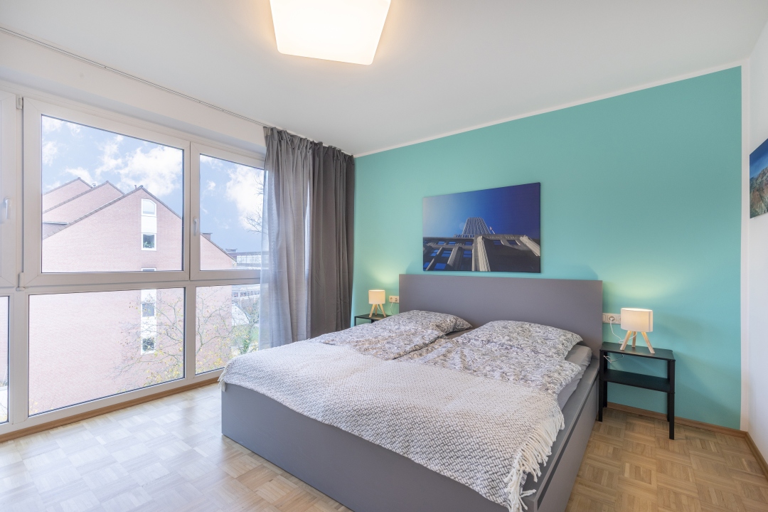 Moderne Möblierung, bodentiefe Fenster, Naturholz-Parkettboden, integrierte, voll-ausgestattete Einbauküche mit: Theke, Backofen, Kochfeld. Tageslicht Duschbad, Kabel-TV, WLAN-Internetanschluss, Waschmaschine und Trockner.